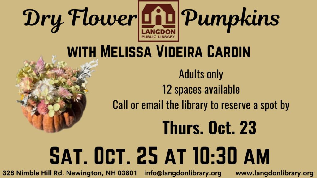 Newington resident, Melissa Videira Cardin, will be instructing 12 adults on how to decorate pumpkins with dry flowers. If you have a small to medium size pumpkin please bring it! This is an adult only program with 12 spaces available. Call or email the library to reserve a spot!