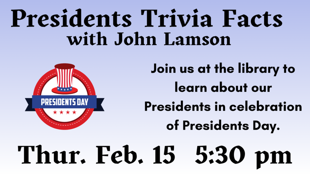 Presidents Trivia with John Lamson An opportunity to test your knowledge our United States presidents. This program is open to all ages.